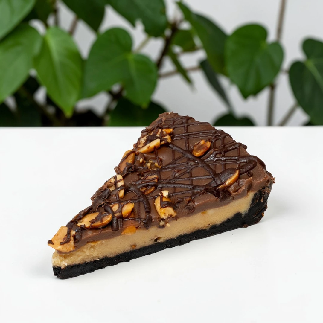 تشيز كيك ناعم مع سنيكرز، كراميل، شوكولاتة ومكسرات مقرمشة.